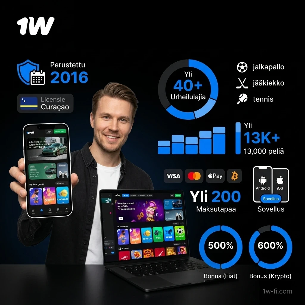 1w on vuodesta 2016 toiminut kansainvälinen vedonlyönti- ja kasinoalusta, jolla on Curaçaon lisenssi ja yli 40 urheilulajia – jalkapallo, jääkiekko, tennis, koripallo ja e-urheilu mukaan lukien. Voit lyödä vetoa live-kohteissa, ennakkoon tai virtuaaliurheilussa. Kasinolta löydät yli 13 000 peliä. Talleta Visan, Mastercardin, Apple Payn tai Bitcoinin avulla – yli 200 maksutapaa käytettävissä. Sovellus on saatavilla Androidille ja iOS:lle. Uusille pelaajille tarjolla jopa 500 % bonuspaketti fiat-talletuksille tai 600 % kryptopaketti.